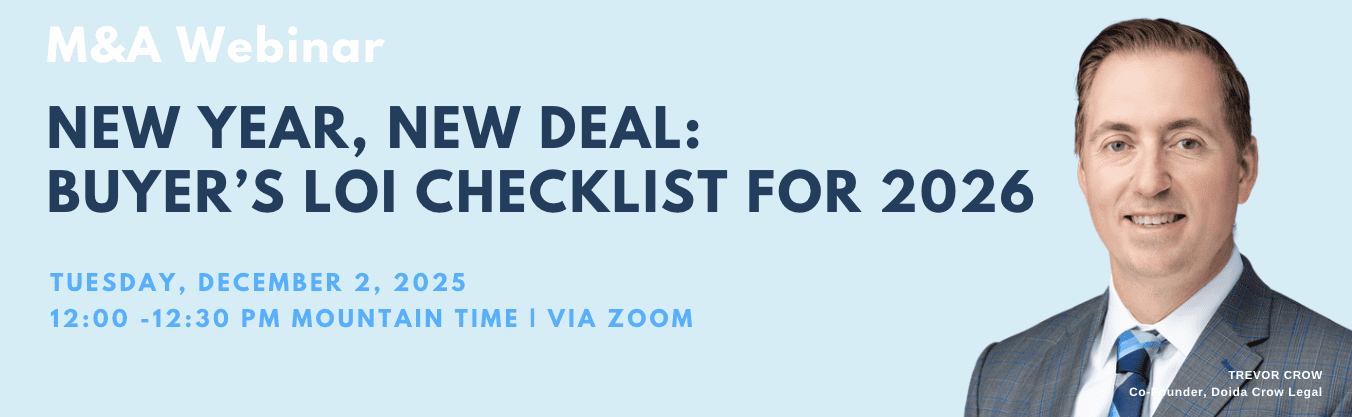 The strongest deals in early 2026 will go to those who are ready to submit a clean, compelling, and strategic Letter of Intent (LOI) the moment the right opportunity appears. Join Doida Crow Legal’s co-founder, Trevor Crow, for a focused, practical 30-minute webinar designed specifically for buyers who want to start the new year ahead of the competition.